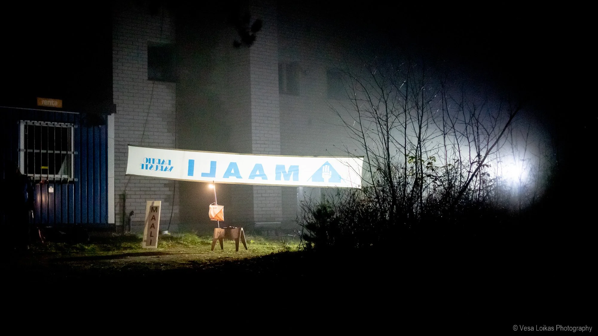 Man in blue jacket setting up a sign with the name 'Maali' under a banner that says 'Maali Varustus' at night. View fullsize