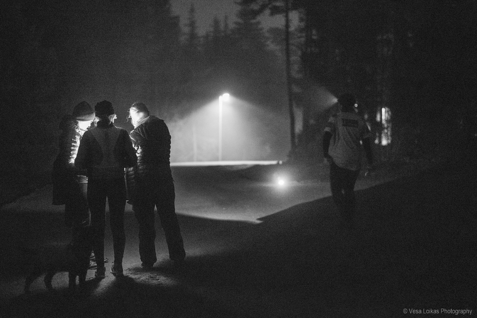 A group of people gathered around a small table on a dimly lit outdoor trail at night. A woman is leaning forward, engaging with the table, which has a sign that says 'LÄHTO'. Others are standing nearby, some with headlamps, in a forested area. The s View fullsize